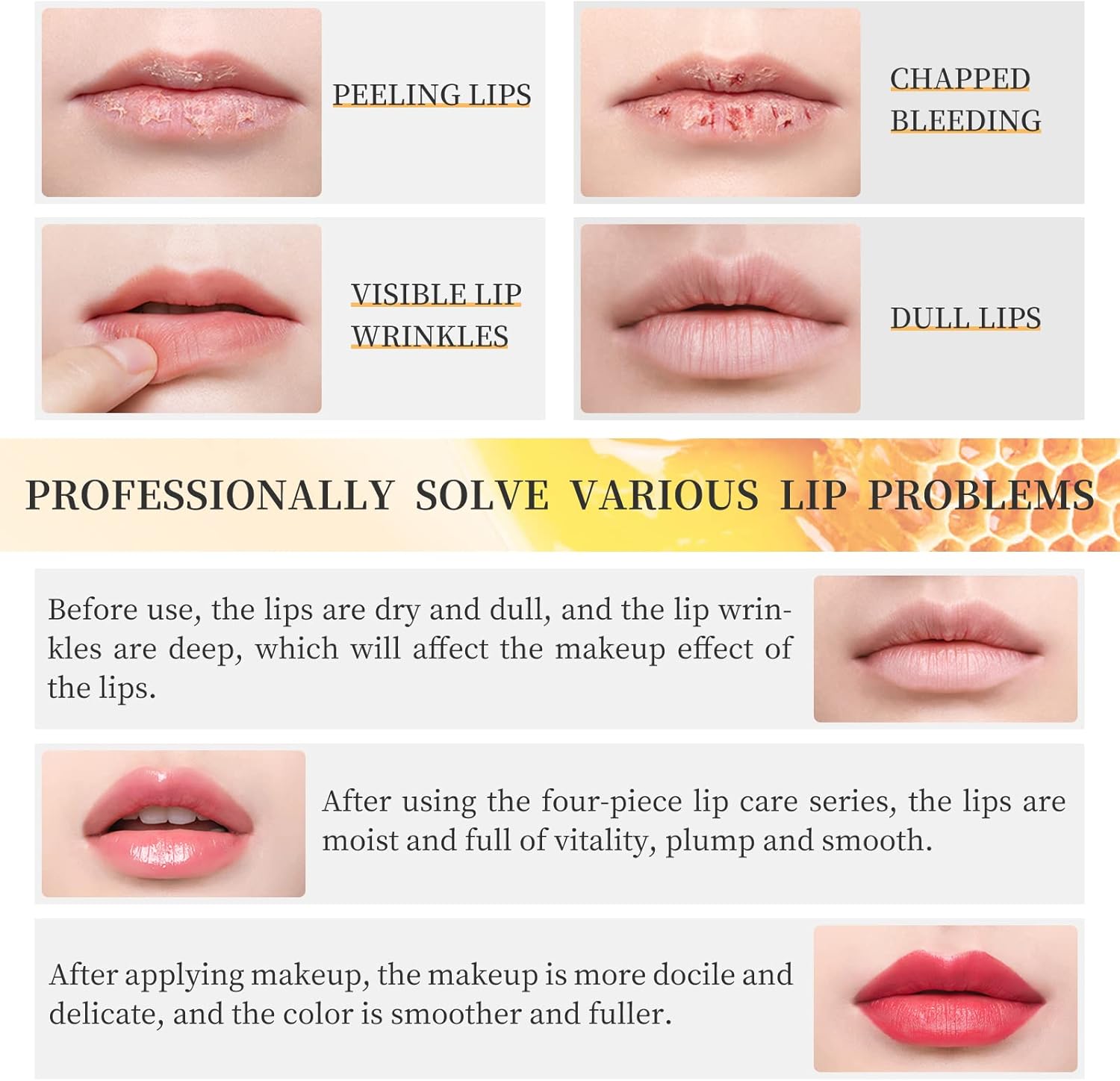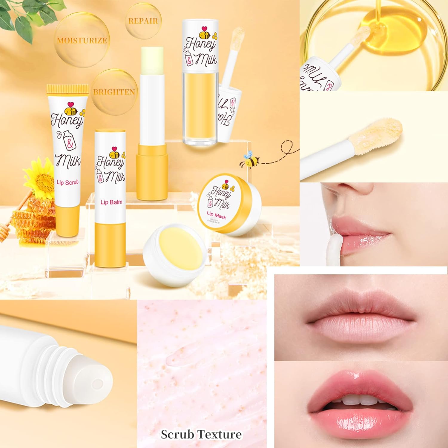 4 Piece Honey Milk Lip Mask Lip Balm Lip Scrub Lip Oil Lip Care Kit, Moisturizing & Nourishing Dry and Cracked Lips, Overnight Sleeping Lip Exfoliator Lip Moisturizer Lip Repair
